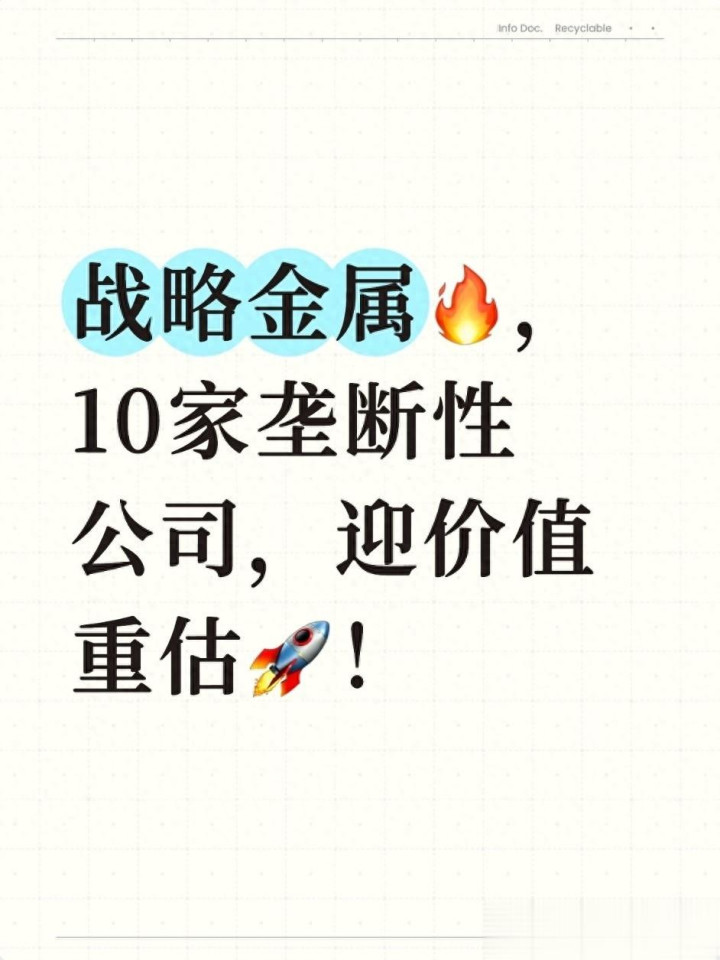 你认为在这10家垄断性龙头中,哪家公司的长期增长潜力最大?又或者你还发现了哪些具备稀缺性的战略金属企业?欢迎在评论区分享你的观点,一起交流探讨!如果觉得这篇内容有帮助,欢迎点赞+收藏,后续还会为大家带来更多战略金属产业的深度分析。